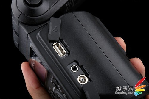 灯身右侧配备了FT-16无线引闪器接受器端口、3.5mm和PC同步端口