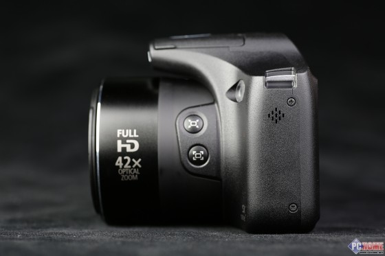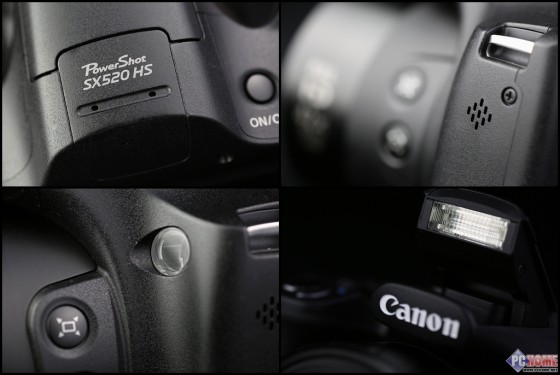 SX520的内置反光灯设计比较特别,并非常见的按键打开方式,而是通过手动直接打开,也因此在闪光灯的前端左右各有一个突起,用于打开闪光灯。