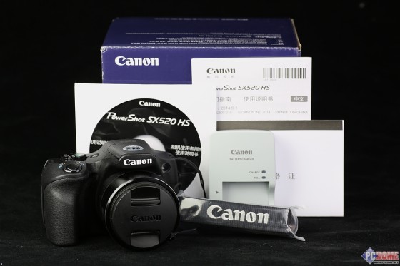 佳能博秀SX520 HS的包装盒以深蓝色为主基调,包含:SX520机身、使用说明书光盘、电池充电器CB-2LYT、锂离子电池NB-6LH,镜头盖、肩带。机身为黑色类单反设计,塑料材质为主,包含电池的整体重量只有约441克,可以说相当的轻巧便携。
