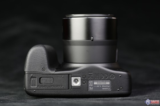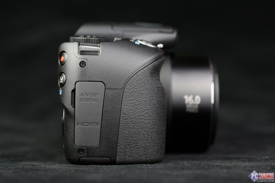 机身右侧为接口仓,内藏A/V输出和HDMI输出接口。从这个角度可以看出SX520的手柄比较厚实,这样的设计对于握持感的提升不言而喻。