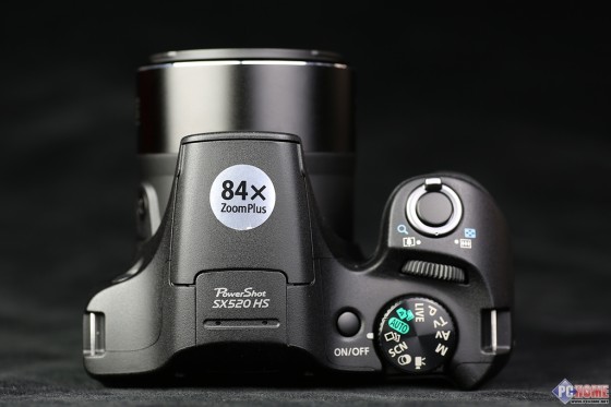 顶部除了常规的快门键、变焦杆、模式拨盘外,电源键和操控拨轮也被安排在了顶部。除此之外我们也可以看到内置闪光灯后面的麦克风为立体声设计。大家一定看到了印有84X的圆形标贴,42x乘上2x的“超解像”数码变焦就是84x。