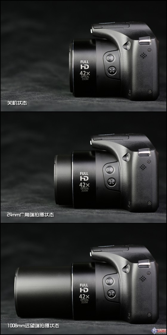 佳能博秀SX520 HS,关机、广角端、远望端镜头伸出长度对比
