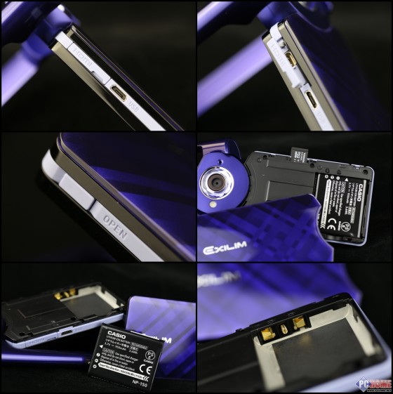 看了一圈大家是不是没有看到相机的必要结构电池仓和接口仓?用过TR350的朋友应该已经知道答案了,它们就在机身上,前提是先要使机身和手柄暂时分开下 (不合在一起)。我们可以看到USB口类似于手机设计,是没有相应保护盖的,而边上的保护盖中就是HDMI接口。另一边有一个标注OPEN的按键,是电池 仓的开关。按下OPEN按键就可以打开前面版,电池槽和卡槽都在其中。