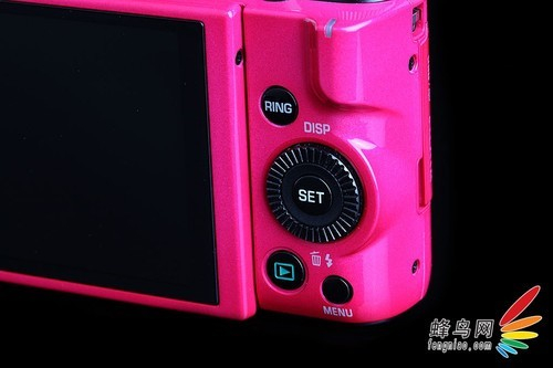 机身背面右侧设有手动拨盘、照片查看键和菜单键,比较特别的就是手柄拇指处的“RING”键,上面提到的镜头外圈的多功能控制环的诸多功能就是通过它设置的。