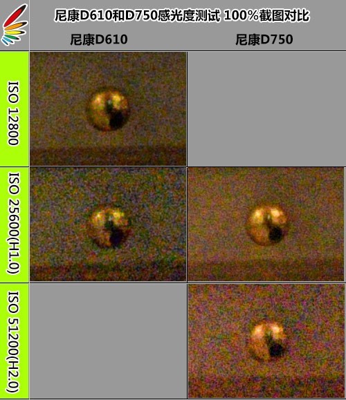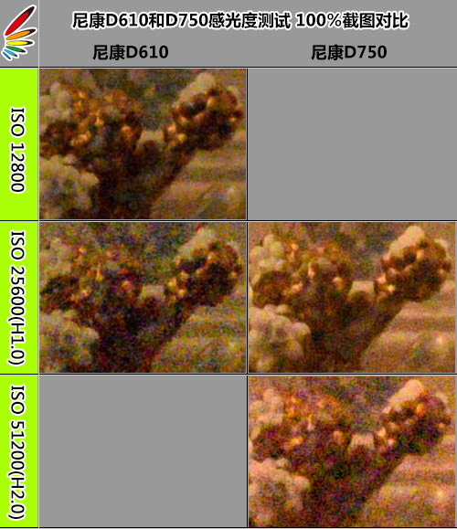 处理器方面,虽然采用了同一块像素数基本相同(D610约2466万像素、D750约2493万像素)的感光元件,D610采用的EXPEED3处理器, 而D750采用和D810一样的EXPEED4处理器,使得D750在ISO 6400以上感光度时,噪点控制水平相比D610有了明显的改善。