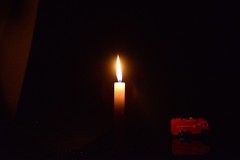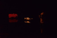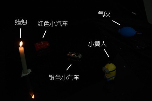 暗光的测试场景是,我们将评测室的灯关闭,点燃一支蜡烛,分辨由远至近摆上红色小汽车、银色小汽车、小黄人和一个气吹,并用取景器进行相位对焦拍摄方式。
