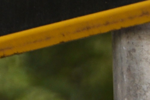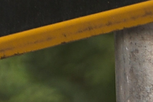 通过100%截图我们可以看到,平面模式下的照片整体偏灰,对比度较小,告示牌边缘和铁管部分锐度加强。