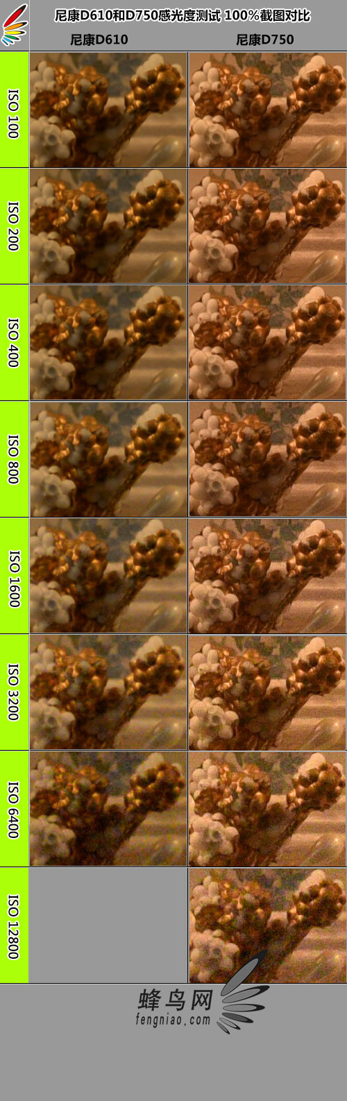 通过对比,在ISO 3200的时候,D610和D750的噪点控制还是可以的,但是一旦高于这个数值,即开始出现较为明显的噪点。在ISO 12800以上时,我们可看到两台机子都已经因为过高的感光度而开始不同程度的失真现象,但直观看来,D750的高感控制表现比D610强不少。