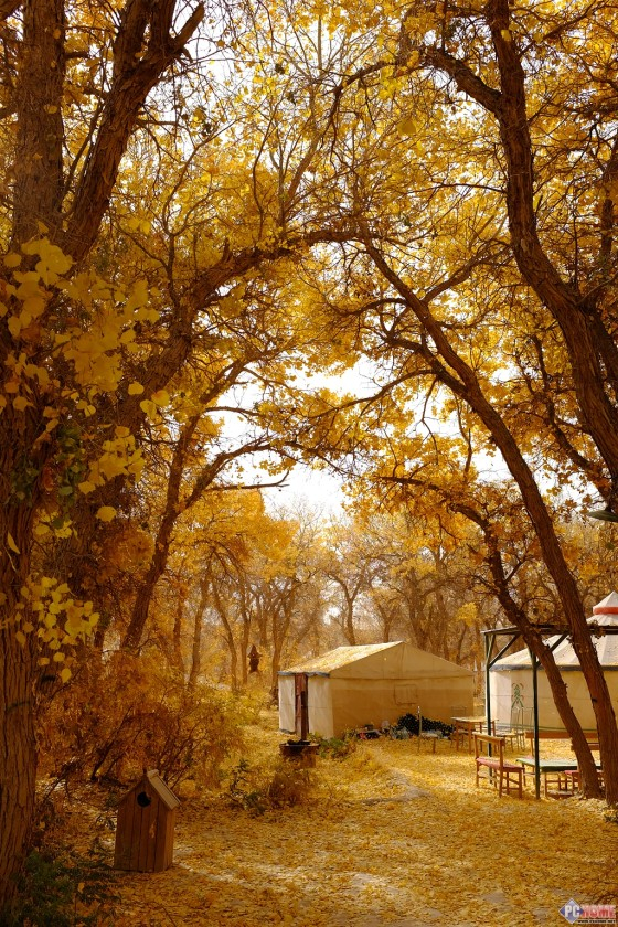 隔天又被突然发配到大西北甘肃去执行项目,在项目结束的最后一天,由于还是舍不得胡杨林的金海美景,想要再去回看留念,就带上了富士X100T,不过不巧的是当天居然遇上沙尘暴……能见度只有2米,游走在"金海"中,我只能收获初冬的《胡杨晚宴》了。