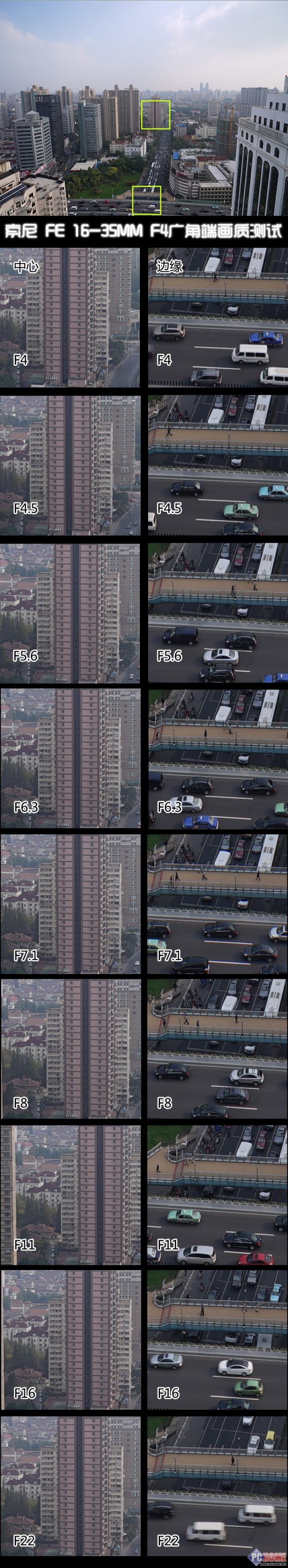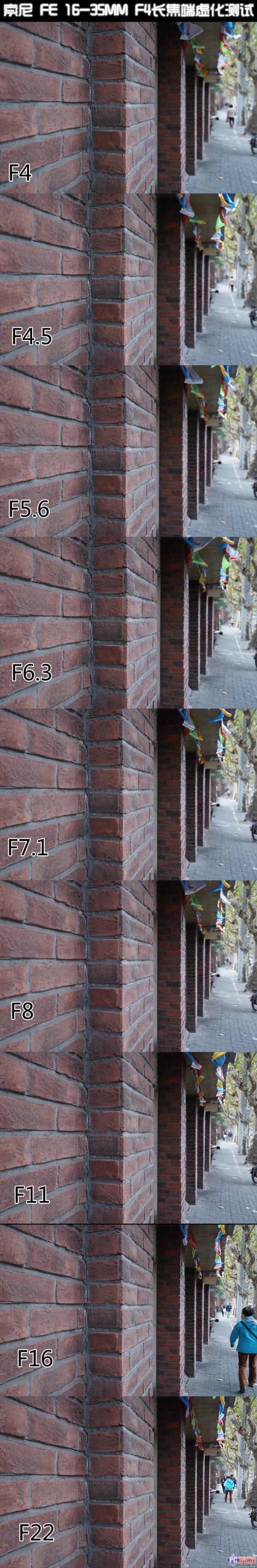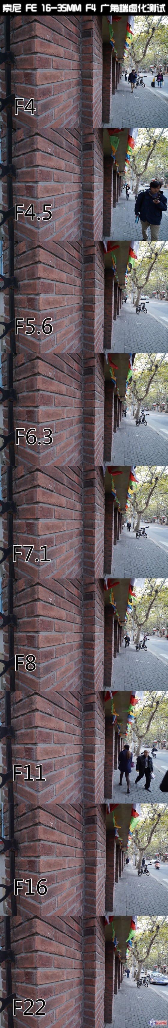我们测试的是16mm端和35mm端各级光圈下的中心与边缘的画质,分别使用黄色框部份进行100%截图对比。在16mm广角端样张的中心的部分,当镜头光圈全开的时候,画质保持着相当出色的品质,直到F16才开始有明显的衰竭,不过假如没有什么特殊要求的话,这一级别的光圈实用性并不是很大。而在图像的边缘部分,我们也可以清晰的看到画面也保持着不错的画质,直到F16之后才有明显的模糊。而在35mm端的画质比对,中我们也可以看到无论是画面中心还是边缘的图像,在光圈值为F16光圈之后开始衰竭,锐度开始降低,这也是相当正常的表现。