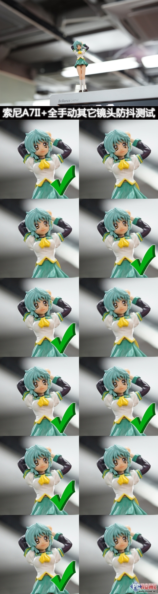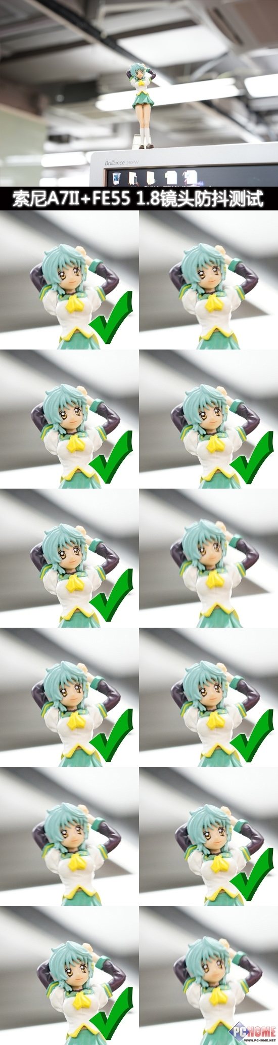 我们采用速度优先模式设置快门为1/4秒,连续对焦手办脸部拍摄12张,截图查看其清晰画面成功率。索尼A7II和索蔡FE55 F1.8的组合有8张是清晰可用的,成功率达到67%