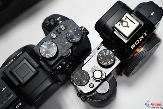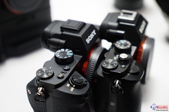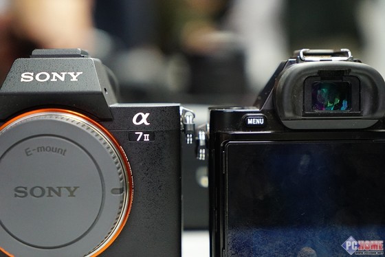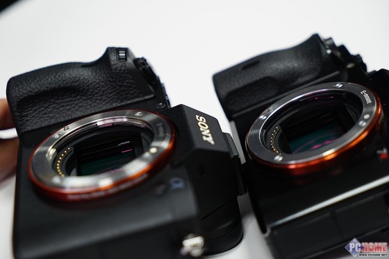 从索尼A7II和A7R的机身正面来看,新机内置EVF取景器的军舰部分变得更为小巧了,当然236万有效像素和A7R的配置完全相同。手柄部分,A7II的手柄正面看上去更像是由单电相机进化而来的,相比A7R要窄上不少。其实手柄部分的改动对于整台相机的升级而言比重还是很大的,这个在之后的图片中我们会详细的像大家展示。