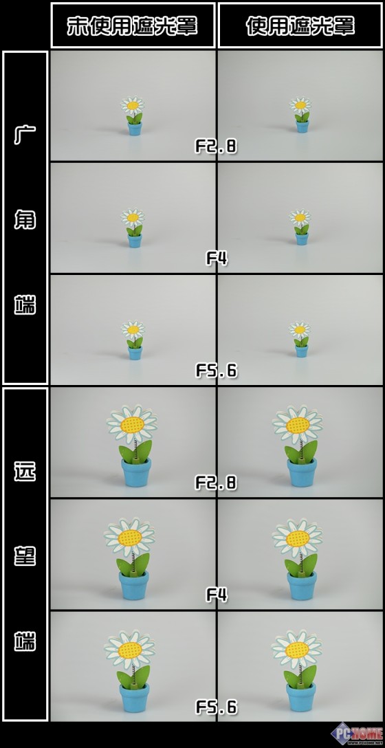 测试结果并没有笔者预想的优秀,无论是广角端还是远望端在全开光圈时都出现了暗角,虽然非常的轻微,但还是需要收两档光圈才会完全消失。而标配的遮光罩也对于周边通光量产生了影响,暗角比未使用遮光罩时有明显的增加。