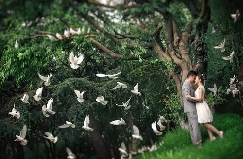 这是在昆明一个很普通的公园内拍摄的,草坪上落着很多鸽子,我安排好新人的位置和姿态后,让助理去赶鸽子,低角度抓拍下了鸽子飞起的瞬间。白鸽在暗调背景前显得格外清晰、灵动,姿态各异,倾斜的构图处理又强化了这种动感。