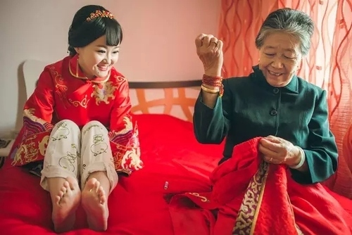 在婚礼的拍摄中,老人和孩子往往最容易带来出彩的画面或是形成催泪点。将新人和长辈或晚辈拍摄在同一画面中,不仅是为了展现亲情,同时也将表达出一种传承的意味。巧妙利用摄影技巧,再加上一定的预见力、感知力,就能捕获到感人且意味深长的画面。婚礼中有一些环节很适合捕捉这类照片,例如敬茶,此时父母和新人都很容易动感情,也有一些习俗是父母要下楼送亲的,这时就可以利用车窗形成的镜面效果,将两代人并置在同一画面中,突出一种家庭的传承意味。这种对比会带来一种思考,很多老人并不了解现在结婚要做些什么,但心里依然充满着祝福,孩子也是,常常只懵懂地、好奇地望着眼前发生的一切。不同年代的人对婚恋的认识是不同的,出现在同一画面里,形成了一种观念上的视觉冲突。摄影师以第三人称视角去看他们的故事,观察他们的表情、动作、眼神,透过镜头记录下这些有趣且发人深省的瞬间。