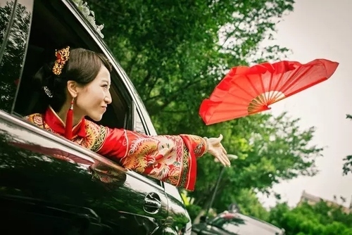 这是当地的一个习俗,新娘在上了婚车后要丢掉扇子,象征着把小姐的坏脾气扔掉。为了避开繁杂的环境,突显出被抛出的扇子,我选择利用天空为背景仰拍。这时黑色的汽车、红色的礼服、白色的天空、绿色的树木构成了这幅极具感染力的画面。