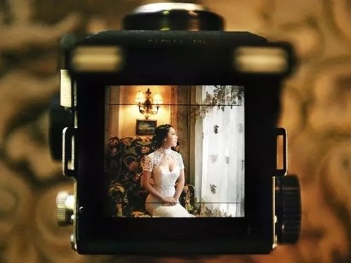 我利用新娘家的中画幅海鸥相机作为道具,先调整好相机的取景框完成基本构图,然后让新娘坐进去,对焦完成拍摄。我在相机下面放置了一把同风格的椅子,即使是虚化的背景,也要与取景框内的画面相协调。