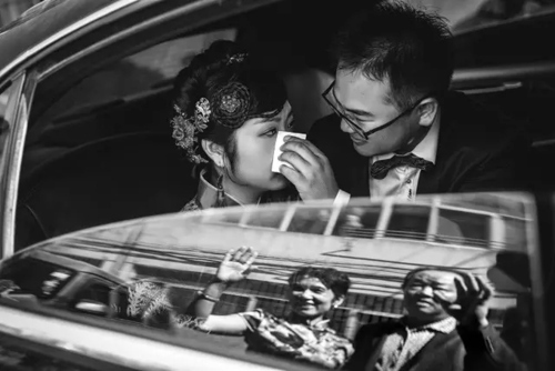 利用车窗产生的镜面效应将送亲的父母和一对新人并置在同一画面里,产生了独特且耐人寻味的隐喻效果。车窗刚好开到一半,贴过膜的玻璃反光非常清楚,调整拍摄角度,使四人都在画面中得到完美呈现。一次送别,一份担当,一种传承。这种对比,带来的复杂的多义性是这张照片最大的亮点。