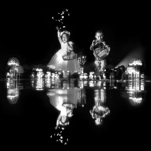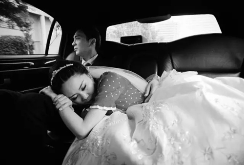 车子正在行驶中,新娘趴在新郎的腿上休息,当时车内光线的变化很快,两人的受光情况也不好控制。但两人的表情特别好,自然而有故事,于是我伺机捕捉到了光线照射到新郎脸上的瞬间。我喜欢明暗对比强烈的画面,后期我将其调整为黑白,又强化了这种影调质感。