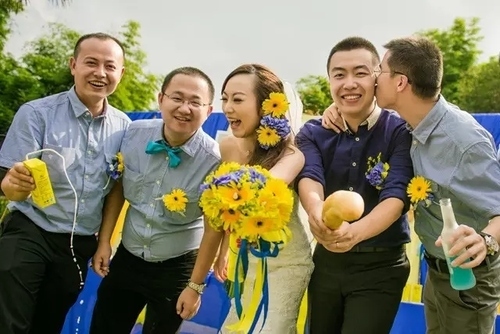 婚礼的主题色是黄色和蓝色,明快而跳跃,这恰好烘托了婚礼欢乐、轻松的氛围,利用天空和绿树作为背景,使画面更加清新、柔和。