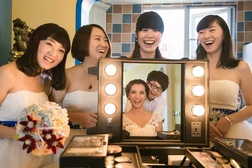 我最喜欢拍摄新娘和伴娘之间的交流和互动,利用化妆镜可以将对面而立的两拨人融进同一画面,让每一个人的表情细节都得到最佳呈现,将当时的状态和情绪最大化地凝固成为瞬间。