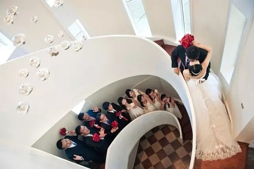 新娘家有一个漂亮的海螺状旋转楼梯,看到时我就在想该如何利用好它。只拍两个人会令画面显得太空,于是我就召集来新人的亲朋好友,其实他们在下面完全看不见上面的新人。我站在高处俯拍,利用视觉错差,营造出一种感觉,让人们以为亲友正在注视着一对新人,为他们欢呼。