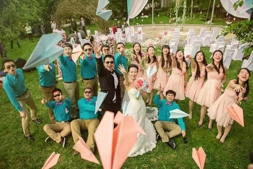 婚礼的主题就是与跟纸飞机有关的。典礼仪式后,新人想让我也拍一下他们最爱的纸飞机。飞机小,且数量也很少,于是我利用了广角镜头夸大前景的特点,站在梯子上俯拍,让他们将纸飞机一起扔向镜头。突出了纸飞机,也强化了空间的透视感。