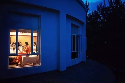 这场婚礼是在夏天,晚上七点开始,其间新娘去到另一栋楼里进行变装。那时天还未全黑,我在屋外拍下了新娘化妆间的窗口。由于环境色温的差异,使房间内外形成了鲜明的冷暖对比效果,别有一番味道。