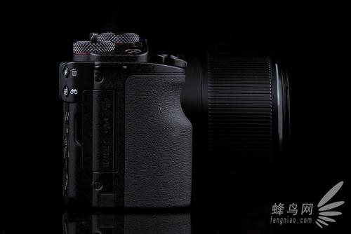 从机身侧面的图片中我们也可以看到佳能G3 X机身握持手柄的尺寸还是相当厚的,流线型外观的手柄符合人体工程学设计,握持舒适且不易滑落。