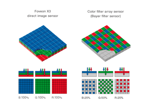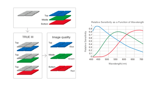 Foveon三层图像传感器利用不同颜色的光波长不同的特性,在硅板的不同深度分别配置有三层光电二极管阵列,从而可以在垂直方向将颜色分离的世界上唯 一一款直接感光方式图像传感器。Foveon图像传感器在垂直方向进行色彩分离,每个像素都能保留完整的色彩信息,展现出自然丰富的层次和色彩过渡。并且 由于其特殊构造不会损失光线信息,所以不需要掩盖摩尔纹和假色的低通滤镜。