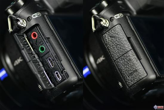在机身的左侧,是RX10M2的SD卡槽与NFC感应区域。与索尼RX100M4有区别的是,索尼RX10M2的SD卡槽没有与电池仓整合在一起,而是独立于机身的一边,这或许是因为空间宽裕而做的设计,又或许是与一般专业用户的操作习惯保持一致;而在机身的右侧,索尼RX10M2提供了一系列常规的外接插口,例如外界MIC监听耳机,Micro-USB以及HDMI等,基本与专业的DC与DV保持了高度的一致。