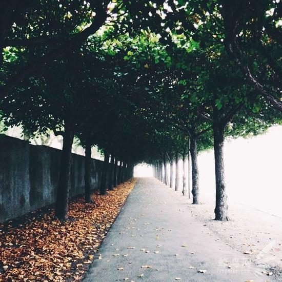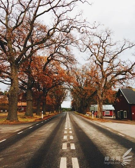 这条公路和旁边一排排五颜六色的树木起到了引导线的作用,引领观众们的视线看向画面深处,由此创造了强烈的景深感。对称性、纵深感与活泼的颜色的这个组 合可是战无不胜的哦!如果你在深秋时节拍摄的话,那么大部分树叶都会从树上飘落下来。但是落到地面上的树叶依旧五彩缤纷,所以一定记得要拍下来。
