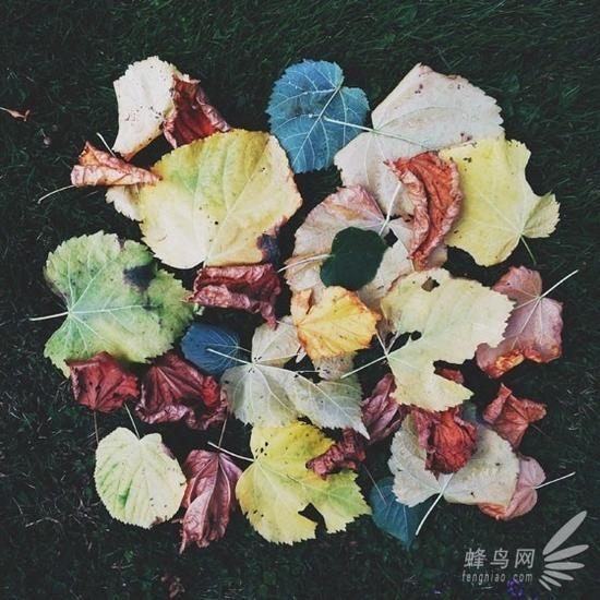 我经常喜欢把我找到的叶子在地上堆成一堆。或者为了看起来更加条理,我会把落叶摆成一个简单的形状。同时可以用小草或是小路作为背景,来获得最大的视觉 冲击力。你有无数种方法可以把落叶摆成一个引人注目的形象。还可以放上一片不同颜色的叶子来打破程式,吸引人们的目光。