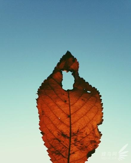 像拍摄一棵孤树一样,拍一片单独的叶子也有类似的效果。如果是经过你精挑细选的一片独特的叶子,往往会比一组叶子的画面更具视觉冲击力。在选择一片叶子的时候,试着选择一片有着独特或有趣特征的叶子,比如这片带洞的叶子。