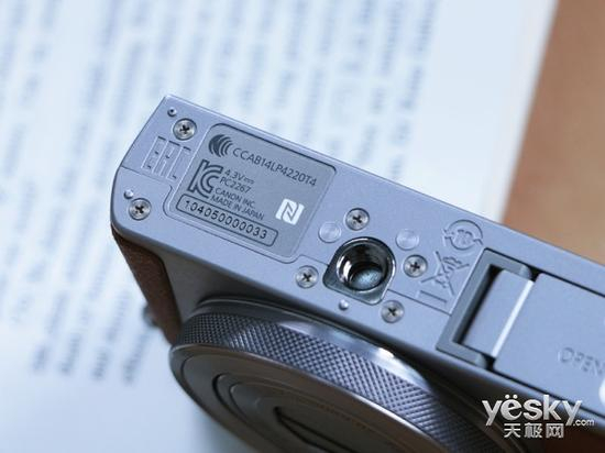 在机身的底部,佳能G9 X为用户设置了一个标准的三脚架安装孔,用户可以根据自己的需要在这款相机上面加装辅助设备。在三脚架安装孔的傍边则是NFC的感应区域,用户可以将带有NFC功能的手机或设备在这个区域与佳能G9 X进行链接。
