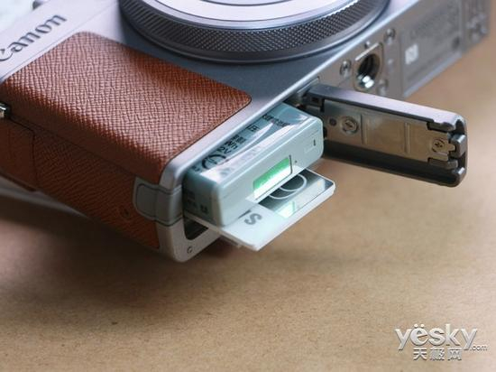 佳能G9 X底部的另一侧是这款相机的电池仓和存储卡卡槽的位置,该机搭载的是一块1250毫安的锂电池,这块电池可以满足在普通使用情况下的基本需要。紧挨着电池的是存储卡的安装位置,佳能G9 X使用的是现在很常见的SD存储卡,用户在任何地方都可以购买到这种存储卡,在外出旅游的时候也不用担心存储空间不足等问题。