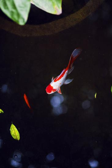 百无聊赖的旅途中的一个清晨,我坐在酒店的小院子里吹着风。小院子里有一方小小的池塘,塘里用大缸养着荷花,还有各色的金鱼。早晨的阳光透过树荫把影子 洒在池塘中,银色的小光斑随波逐流,一两片飘落的小叶子在水面上摇啊晃啊,煞是可爱。我看着这幕池塘里的小小画框,想拍一张金鱼游水图的点子在我脑海中形 成。回房间取了相机,我默默在池边守了一会。等待那条红白小金鱼终于游入了我的画框,才按动了快门。