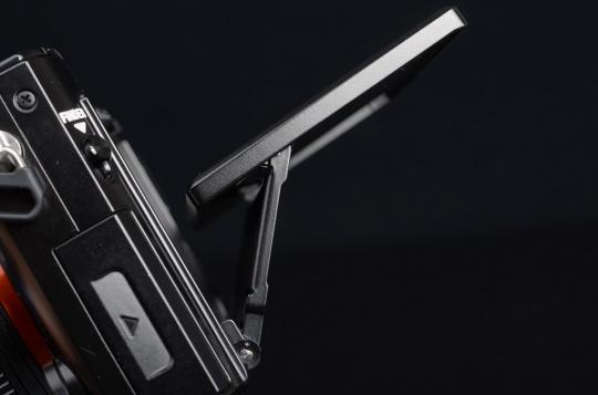 该电子取景器可通过侧面开关弹出,手按收回取景器。这种弹出式设计与RX100 III/RX100 IV类似,但开启操作上要更为简单,取景器弹出后无需再向后拽出,可直接使用。此款取景器采用了蔡司T*镀膜以及四片玻璃镜组,包括两片非球面镜,提供清 晰的对角线可视性和最小化的畸变。相机顶部的热靴依然保留,可外接闪光灯或者FDA-V1K光学取景器。