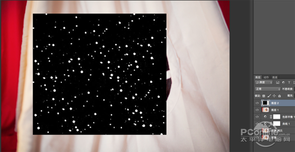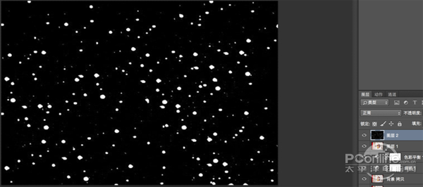 5、增加飘雪效果,首先找一张飘雪的素材(注意素材背景一定要是纯黑的,因为纯黑素材在图层叠加(滤色)的时候可以直接过滤掉黑色,完全不需要抠图);