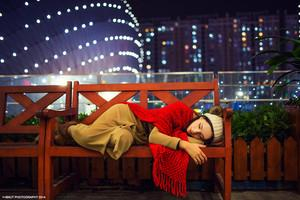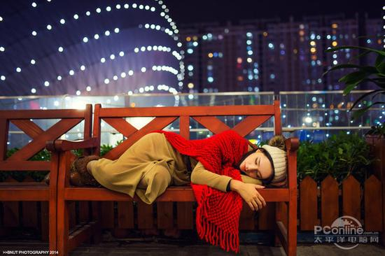 同样,让模特躺下来的原因是,上方有一盏路灯,而路灯可以给人物补光。在这里,要么让模特坐着,抬起头,这样整个脸部都会是亮的;要么像画面这样躺着,就可以形成侧面光,突出人物立体感。总之,在指导动作的时候,要考虑到光源,善于发现并利用环境光线。