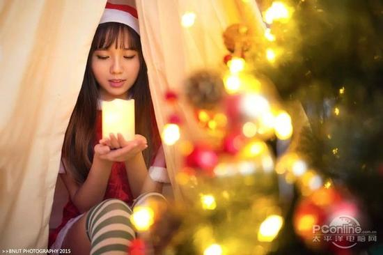 如果室外的光线已经不足以给人物补光,我们就可以让模特拿起补光的道具,比如蜡烛,靠近脸部进行补光;而周围的环境光,则是靠圣诞树上的小彩灯来补的。蜡烛的光较强,小彩灯的光较弱,这样的光比刚好能在突出主体的同时,环境也不至于死黑。