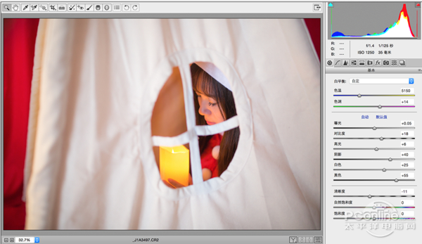 1、Raw的解析,具体调整如上,目的是还原照片的细节。色温的调整要注意还原人物皮肤的颜色,因为蜡烛使得肤色偏黄,所以可以适当加点蓝。清晰度降低一点可以柔化画面;