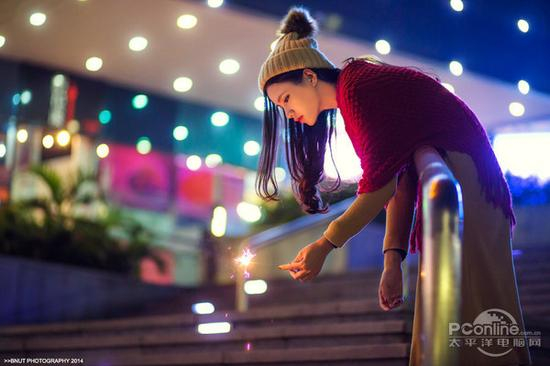 道具方面,还可以准备如图的烟花,这种烟花有两个作用:第一可以用来做道具,迎合整个拍摄主题;第二也是最重要的是可以给人物的面部补光。很多人会问,拍夜景不用闪光灯,人物面部很黑怎么办,就可以这么办。