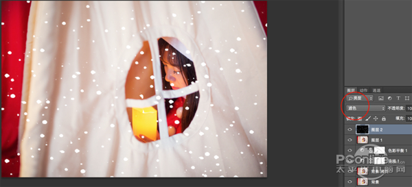 接下来是最关键的,选中雪素材的图层,把图层的混合模式改成“滤色”,就可以完全把黑色的底色过滤掉,只剩下白色的雪;