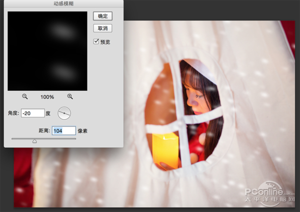 这样雪初步的效果就出来了,数值可以自由把握,以雪花的模糊效果显得真实就好;最后我们还可以做一个动感模糊,模拟雪花飘落的效果,具体步骤:“滤镜—模糊—动感模糊”,这里还需要注意角度和距离,角度最好就是-20度左右会比较接近飘雪的方向,距离也不宜过大,不然雪就会被拉长,不真实。