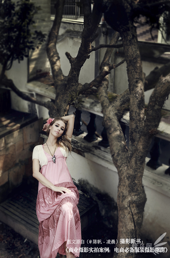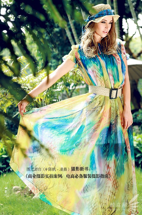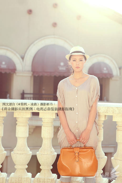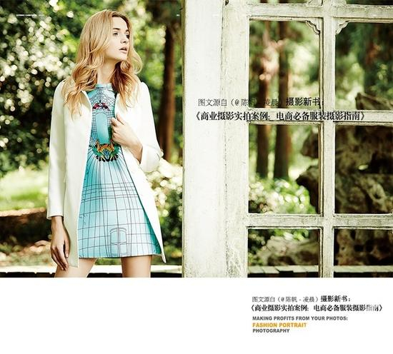 某女装拍摄,选择的拍摄地点是在植物园的一个田园风格的亭子里,亭子里的光线比背景环境光线弱四到五档,如果要人物服装曝光正常,背景会过曝太过呈现一 片亮白,田园场景感会破坏殆尽。所以用了闪光灯来平衡曝光,测光得环境光是F5.6,快门1/500,选择外拍灯控制闪光指数为F4。选择相机M档,设定 光圈F4,快门设定1/125秒,让背景稍微过曝一点,凸显阳光氛围。