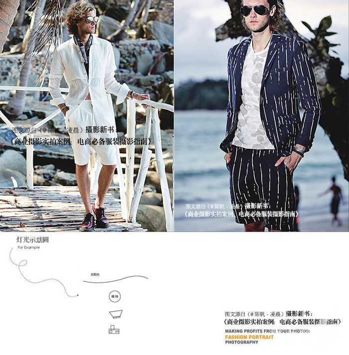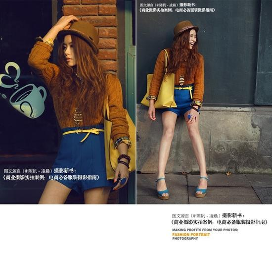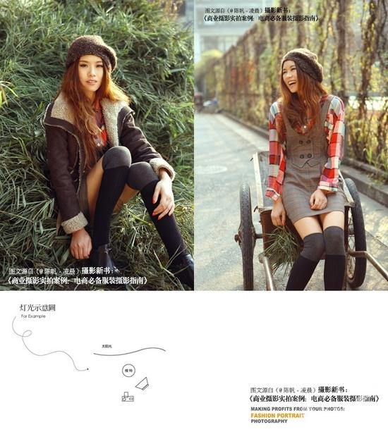 摄影技巧:某品牌女装拍摄,上左图为侧光光位,摄影助理手持闪光灯在模特一侧补光,缩小模特脸部明暗光比。