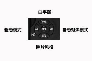 上图红框中的按键,在拍照时分别起到调整白平衡、自动对焦模式、照片风格和驱动模式的作用。