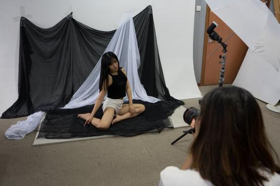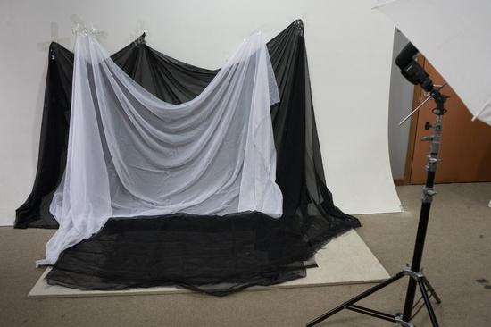 背景布选用了不反光且柔和的黑白雪纺,呈现比较柔的背景效果。在背景的固定过程中,可以适当制造出褶皱效果,因此背景布的长度为一块3米左右即可。我们拍摄时用了黑色白色各3米,互相搭配着布置背景,让背景有起伏错落感。
