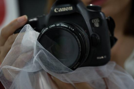 让情绪人像升华的,往往是前景的采用,合适的前景会更突出整个画面的气氛。这次拍摄我们选用了薄纱放在镜头前制造朦胧感,此时注意控制薄纱在镜头前 的位置,在取景器里边观察边挪动薄纱,避免薄纱覆盖住整个画面,要将模特的面部表情突出。挪动薄纱时候注意动作幅度小一些,一丁点的移动在取景器内往往是 大面积的变化,所以这时候要有耐心控制好画面的薄纱入镜量。